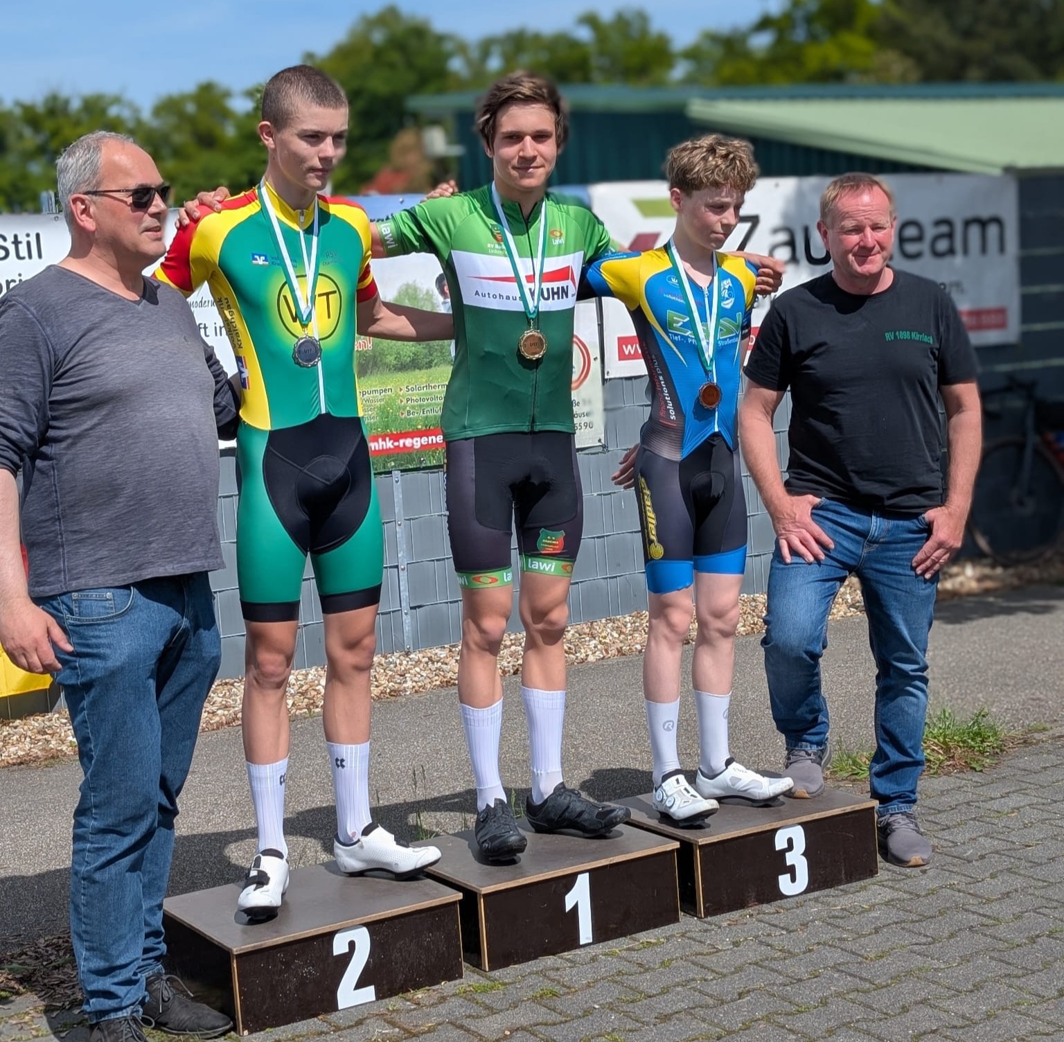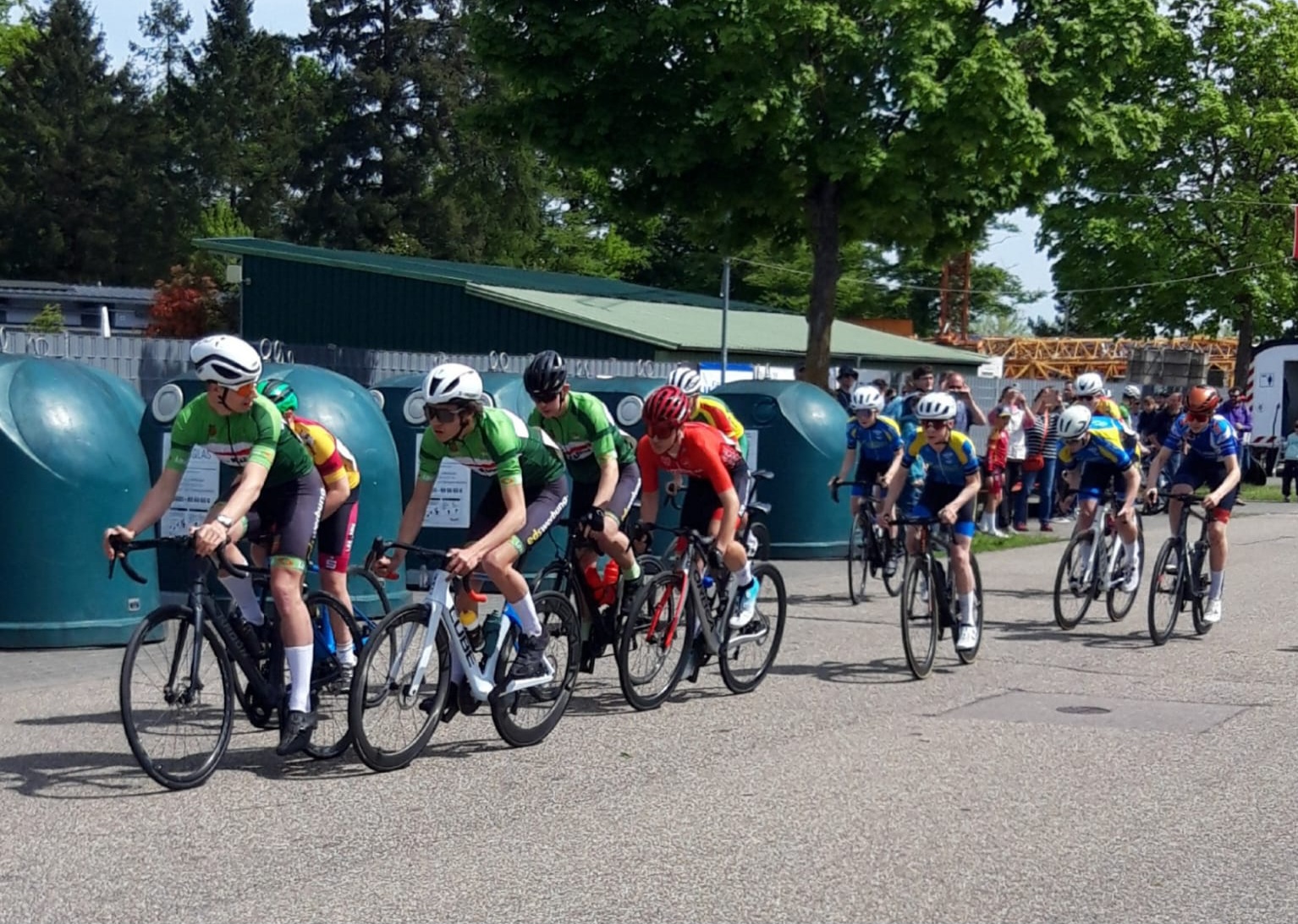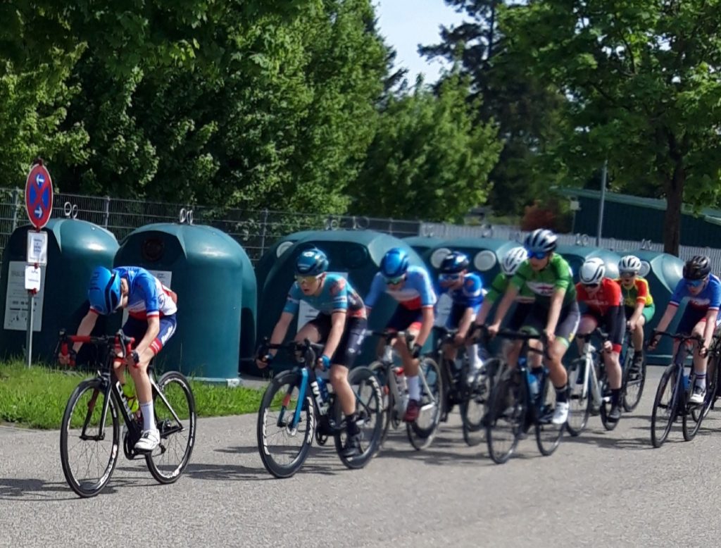 Ruben Schaffer und Leon Höllig gingen beim Kriterium über 28 km in der Klasse U17 an den Start. Gleich zu Beginn setzten sich zwei Fahrer vom Feld ab. Ruben und zwei weiteren Fahrer versuchten noch einmal an die Spitze heran zu kommen, diese war jedoch uneinholbar weg. So ersprinteten sich 2 der 3 Fahrer immer wieder die Wertungspunkte und Ruben hatte die Nase meist vor. Dank Leanders Hilfe konnte sich dann Ruben im Schlusssprint noch wichtige Punkte für den Podiumsplatz sicher und erzielte Platz 3.