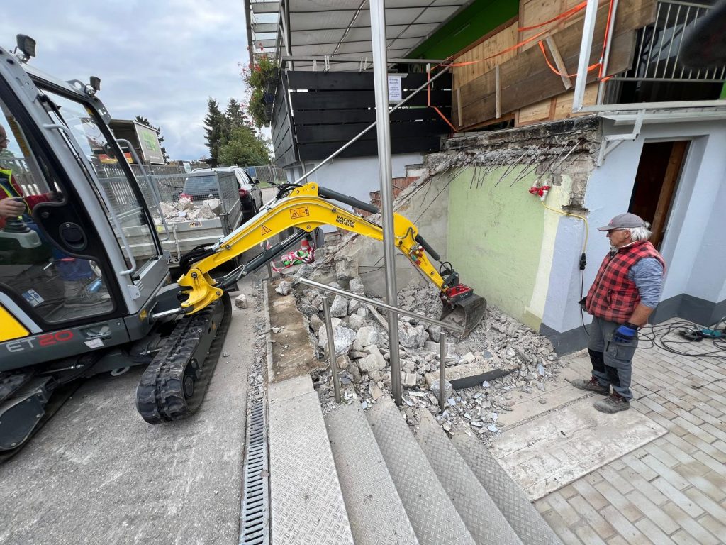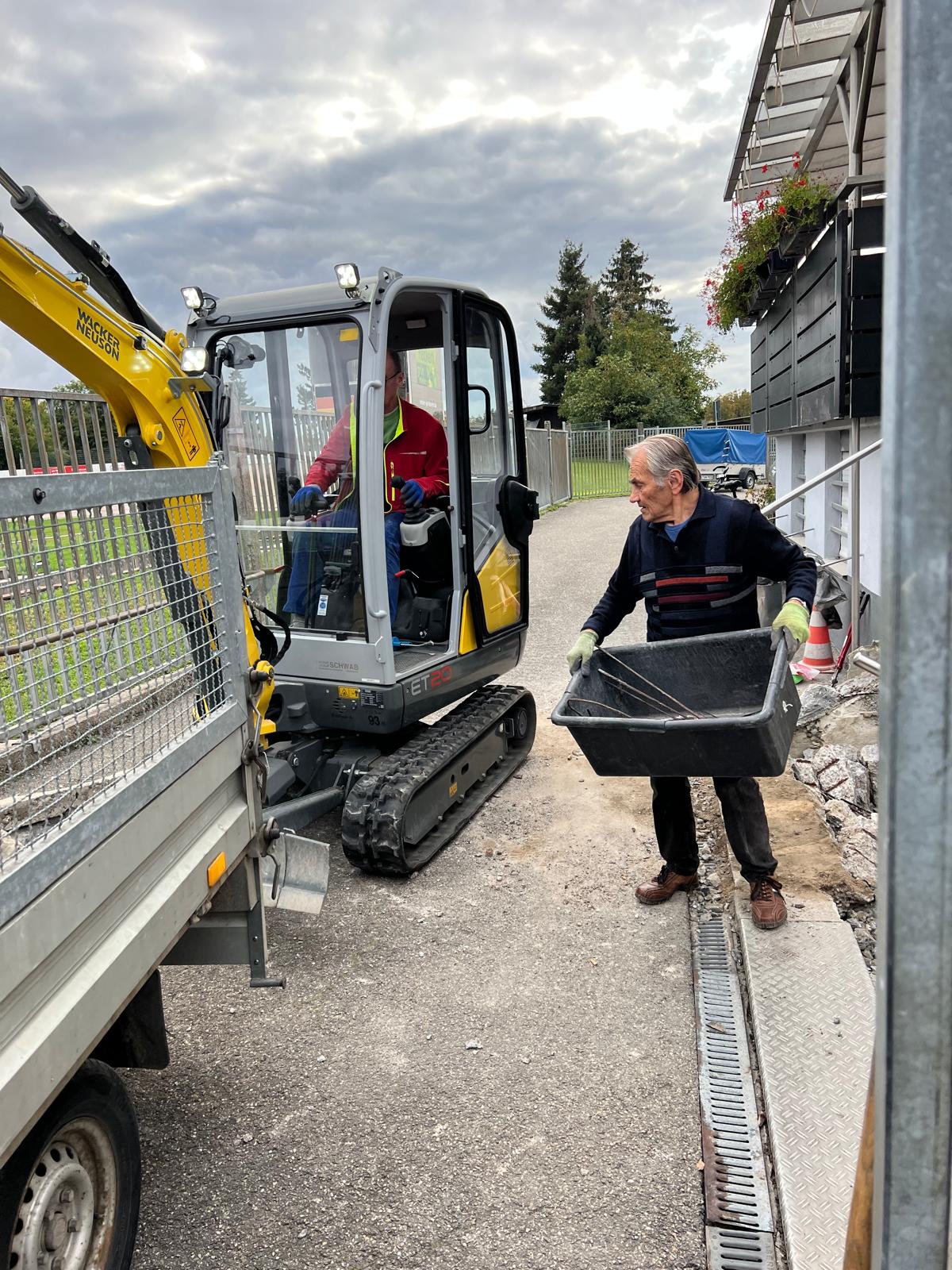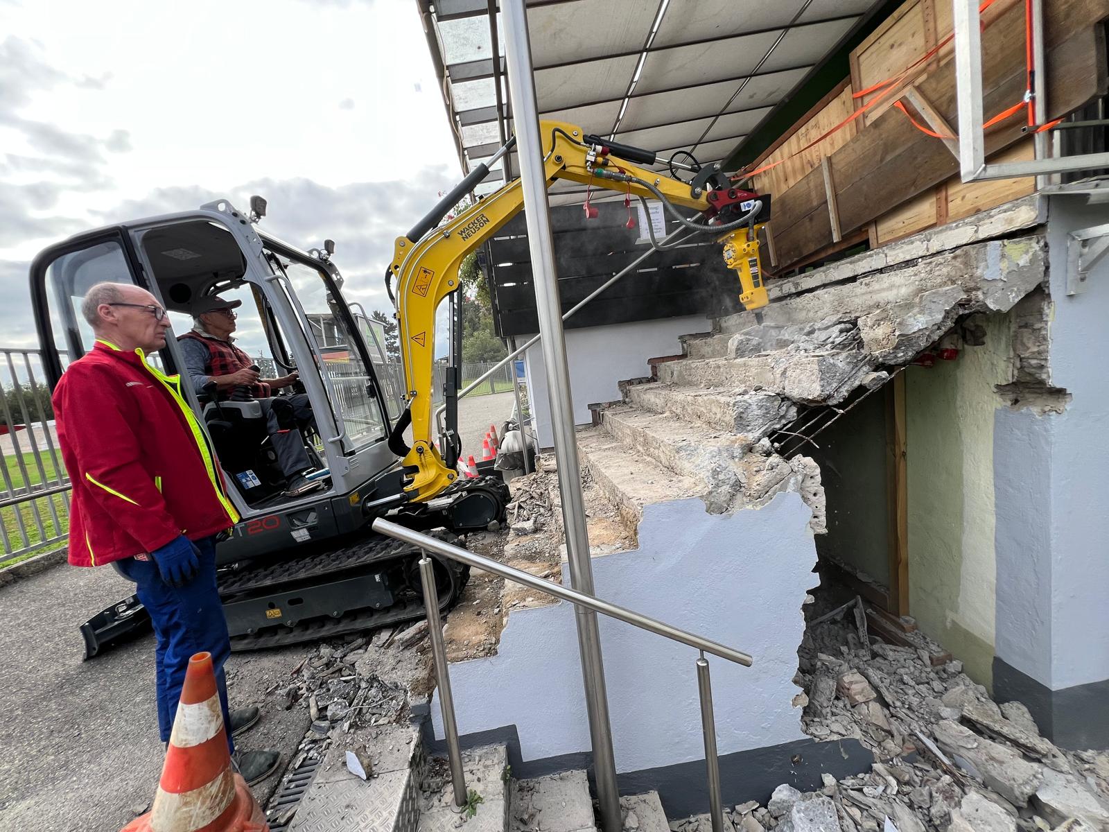 Mit Hilfe eines Baggers, Presslufthammern und anderen Geräten wurde der Beton Stück für Stück abgetragen und das schweren Material entsorgt. Dann wurde das neue Fundament errichtet und die Fläche für die neue Stahltreppe vorbereitet. Selbst als die Firma die neue Treppe lieferte, waren unsere 5 Helfer dabei und packten ordentlich mit an. Nun stehen noch weitere Arbeiten wie der Bau einer Seitenwand und Weiteres an. Harald meinte „Wir sind bereits ein eingespieltes Team und so ist die Arbeit zu bewältigen“. Gewünscht hätte er sich sicher, dass noch das ein oder andere Vereinsmitglied zeitweise mit unterstützt hätte, damit die Arbeit auf mehr Personen hätte verteilt werden können.