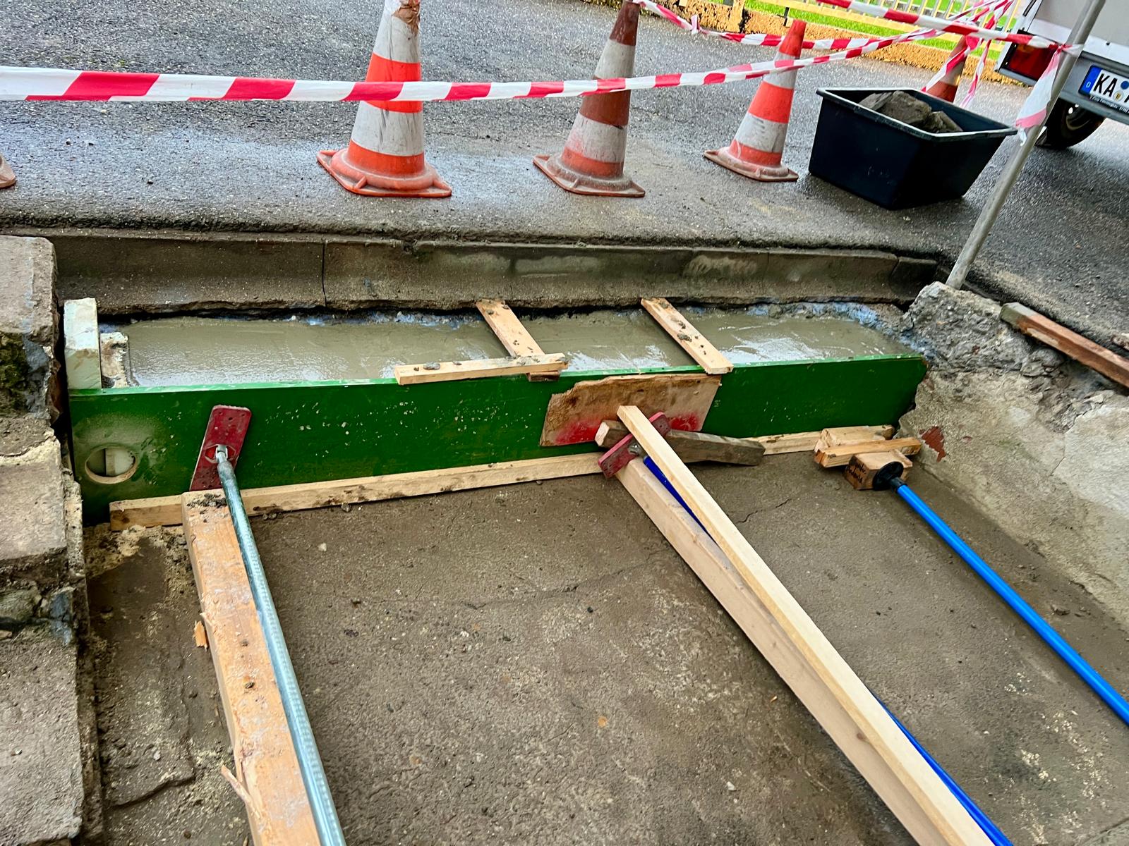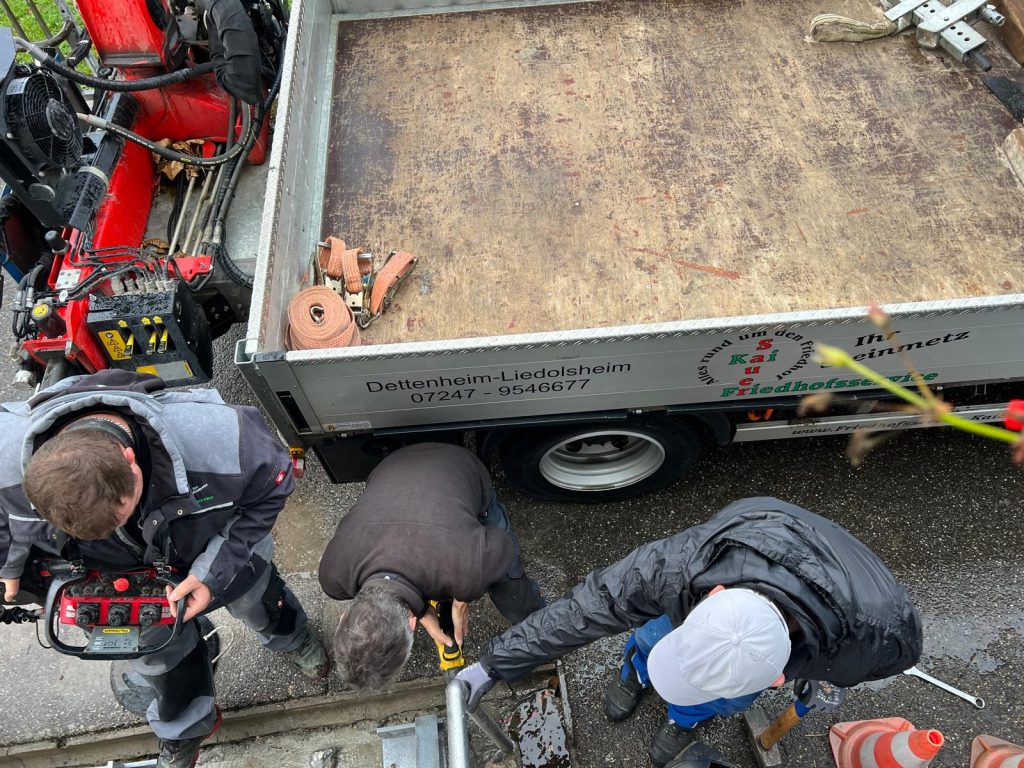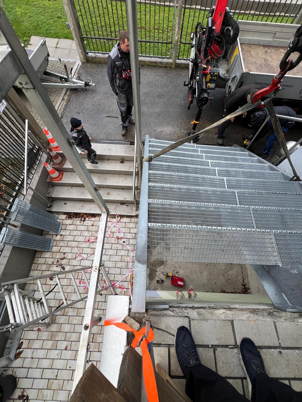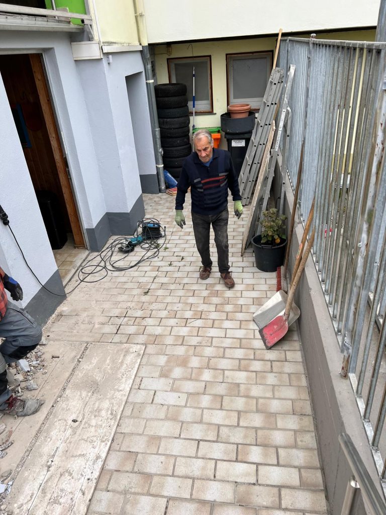 Mit Hilfe eines Baggers, Presslufthammern und anderen Geräten wurde der Beton Stück für Stück abgetragen und das schweren Material entsorgt. Dann wurde das neue Fundament errichtet und die Fläche für die neue Stahltreppe vorbereitet. Selbst als die Firma die neue Treppe lieferte, waren unsere 5 Helfer dabei und packten ordentlich mit an. Nun stehen noch weitere Arbeiten wie der Bau einer Seitenwand und Weiteres an. Harald meinte „Wir sind bereits ein eingespieltes Team und so ist die Arbeit zu bewältigen“. Gewünscht hätte er sich sicher, dass noch das ein oder andere Vereinsmitglied zeitweise mit unterstützt hätte, damit die Arbeit auf mehr Personen hätte verteilt werden können.
