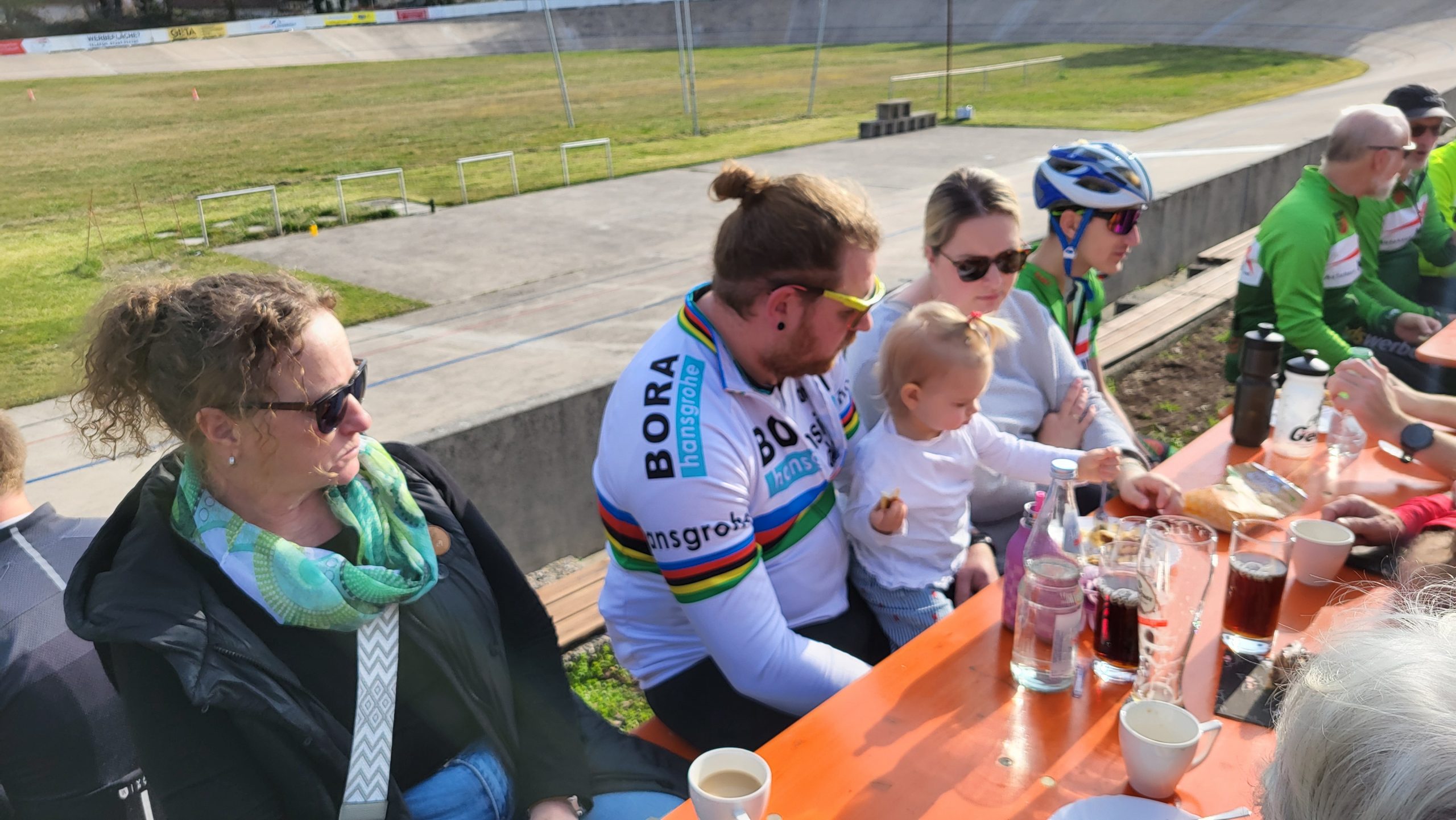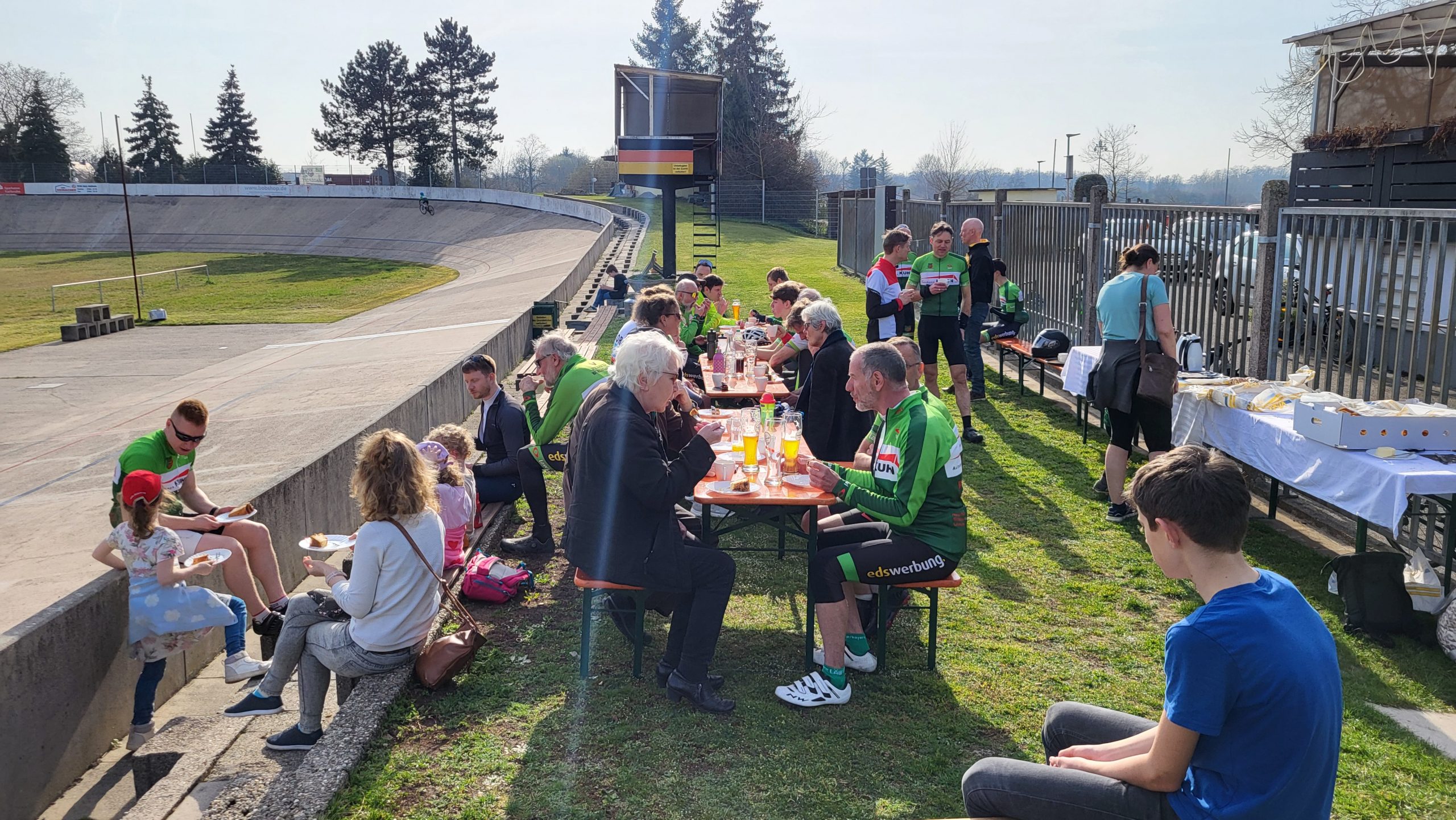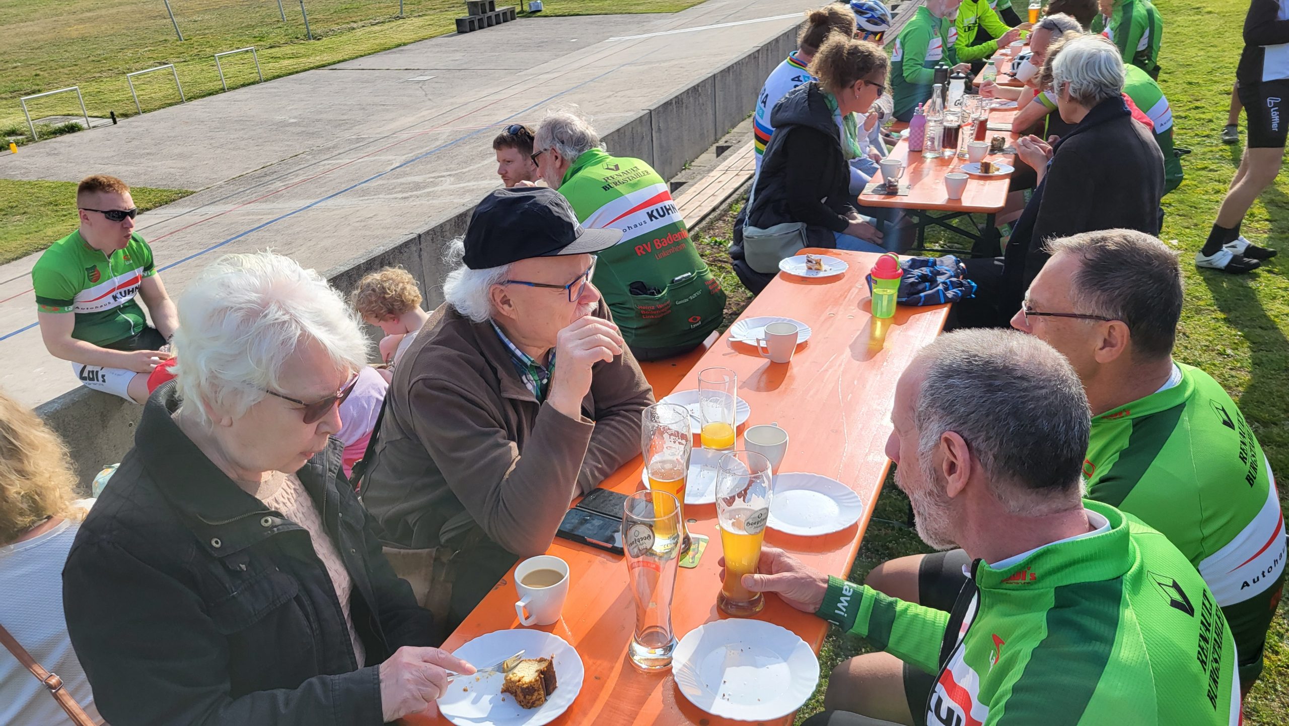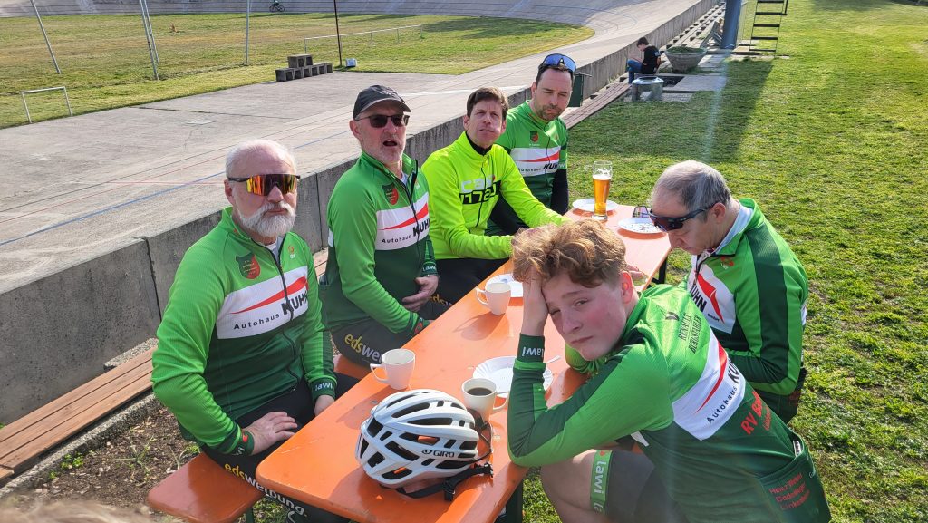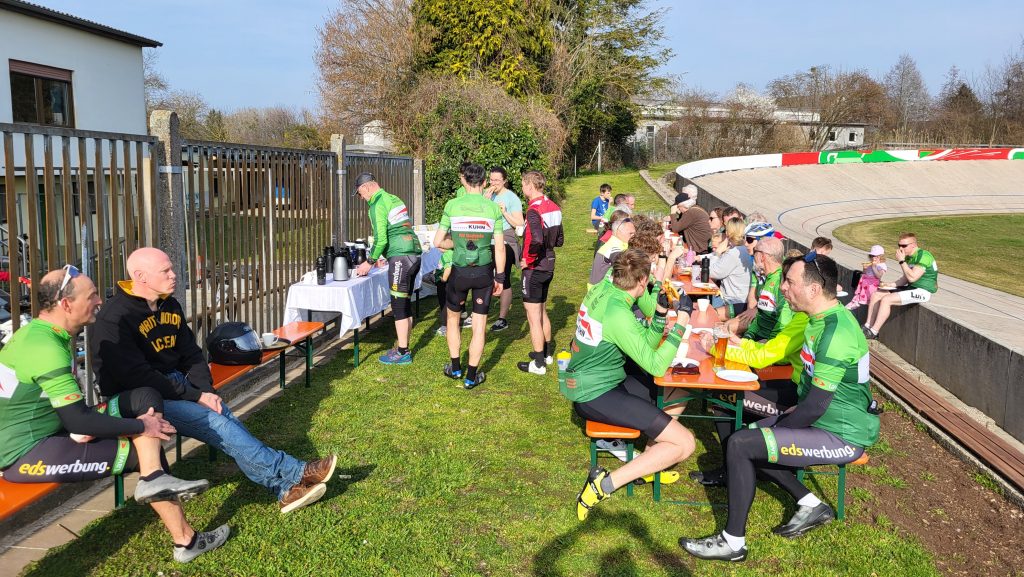 Im Anschluss traf man sich wieder auf der Radrennbahn zum gemütlichen Kaffee-Plausch, bei dem auch einige Vereinsmitglieder teilnahmen, die nicht mitradeln konnten. Einige Nachwuchsfahrer drehten dann noch einige Runden auf der Bahn.