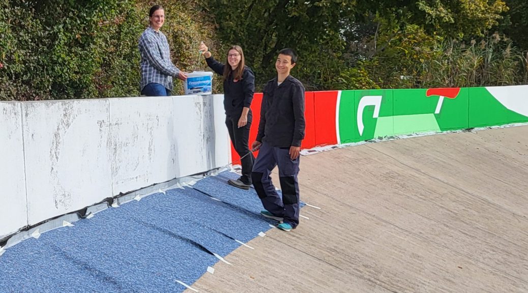 Letzten Monat starteten wir spontan an einem Sammstag eine erste Streichaktion. Laurens, Celine, Jana und Dina begannen den ersten Teil der Bande zu streichen. Man kann ganz deutlich den Unterschied erkennen. Vor circa 10-15 Jahren wurde die Bande das letzte Mal gestrichen.